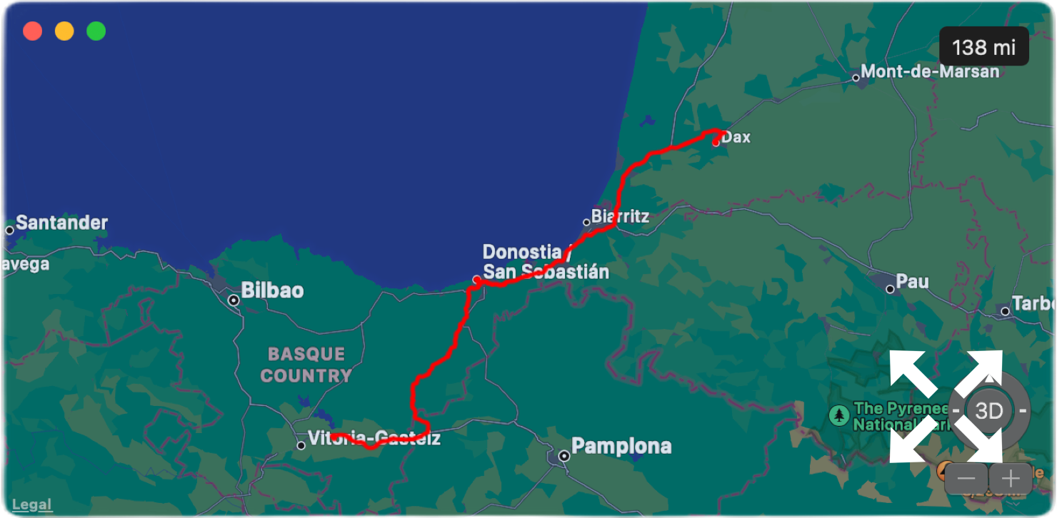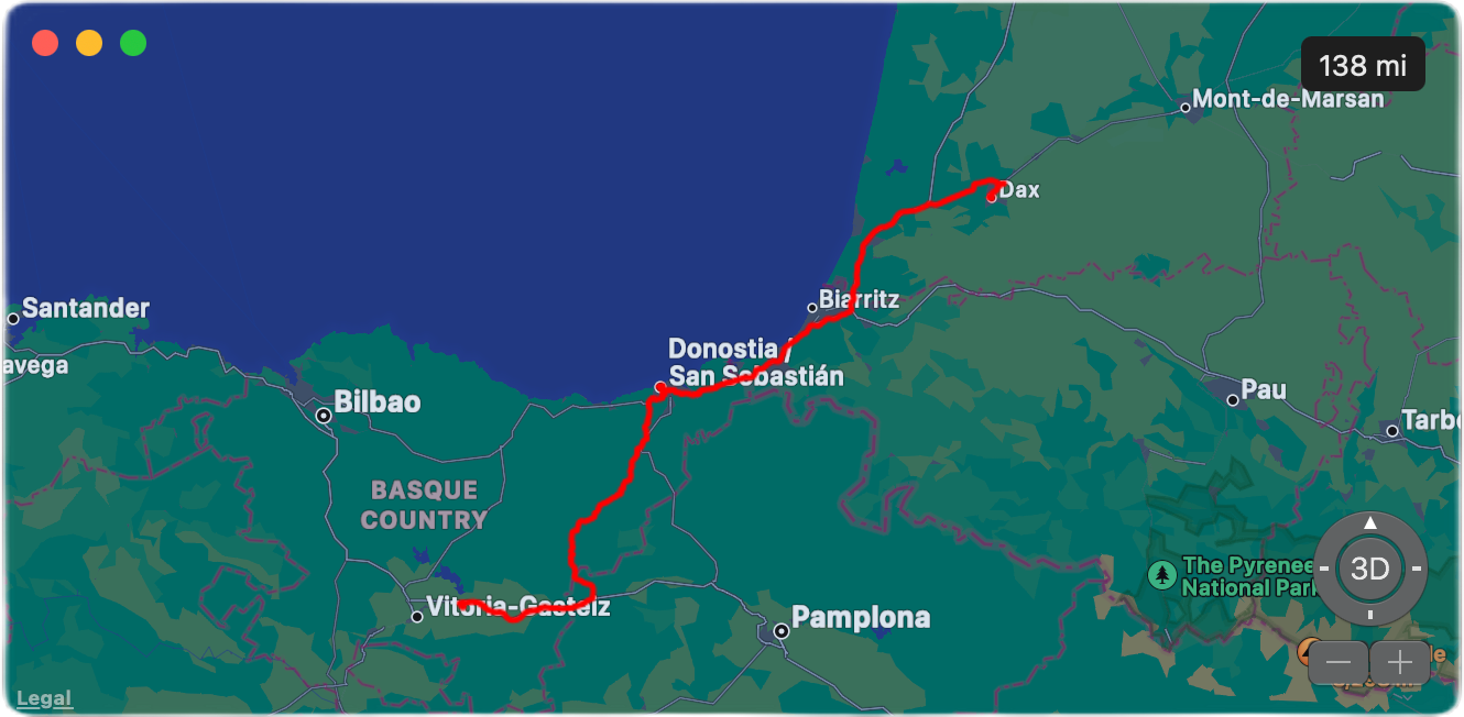 Today began the journey home, travelling from Agromaniz to the Ibis Styles Hotel in Dax, France, with a stop in San Sebastiàn - around 140 miles.